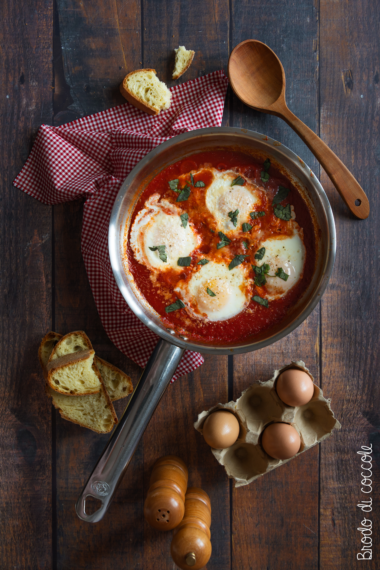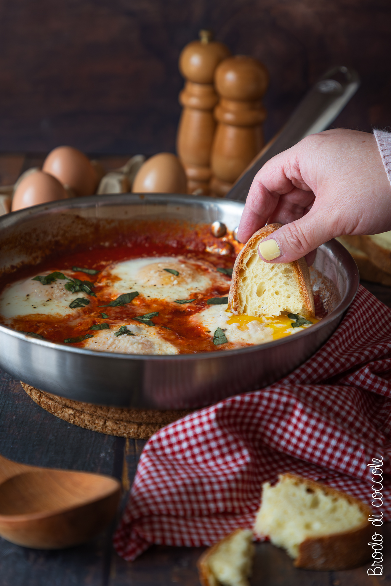 Apri le uova, una per volta in una ciotolina e versale direttamente nel sugo con delicatezza, una accanto all’altra, in modo da mantenere il tuorlo intatto (come se volessi cucinare un uovo a occhio di bue).